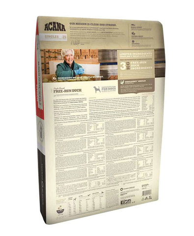 Свежее мясо утки (18%), дегидрированное мясо утки (17%), цельный зеленый горошек, цельная красная чечевица, свежие утиные потрошки (печень, сердце, почки) (7%), утиный жир (6%), свежие груши сорта «Бартлетт» (4%), цельный нут, цельная зеленая чечевица, цельный желтый горошек, сушеные утиные хрящи (2%),клетчатка из чечевицы, морские водоросли – натуральный и биологически доступный источник ДГК и ЭПК (1,2%), свежая цельная мускатная тыква, свежая цельная столовая тыква, сухие бурые водоросли, сублимированная утиная печень (0,1%), соль, свежая цельная клюква, свежая цельная черника, корень цикория, корень куркумы, расторопша, корень лопуха, лаванда, корень алтея, плоды шиповника.
