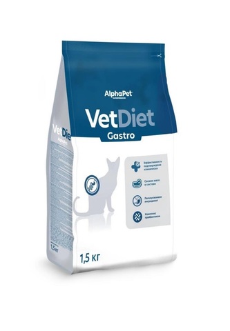 Сухой полнорационный диетический корм AlphaPet VetDiet для взрослых кошек рекомендованный при острых расстройствах пищеварения, в реабилитационный период и при истощении