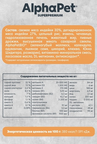 AlphaPet Superpremium MONOPROTEIN / Сухой полнорационный корм из индейки для взрослых кошек