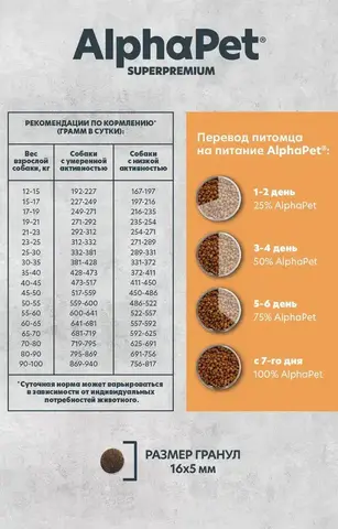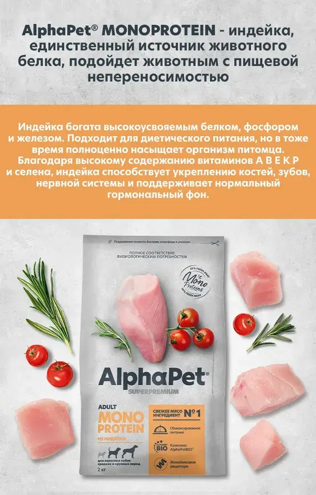 Здоровый и активный питомец – главная задача каждого хозяина. Команда AlphaPet® создает и производит полезные корма высшей категории качества Holistiс, давая возможность каждому владельцу быть уверенным в правильном выборе кормления для своего животного. AlphaPet® MONOPROTEIN - благодаря единственному источнику животного белка, подойдет животным с пищевой непереносимостью. Индейка богата высокоусвояемым белком, фосфором и железом. Подходит для диетического питания, но в тоже время полноценно насыщает организм питомца. Благодаря высокому содержанию витаминов А В Е К Р и селена, индейка впособствует укреплению костей, зубов, нервной системы и поддерживает нормальный гормональный фон. Приготовленно по инновационной технологии из свежего мяса и с содержанием большого процента мясного белка! Линейка кормов AlphaPet® MONOPROTEIN: Свежее мясо ингредиент №1 в составе Большой процент мясного белка Формула "MONOPROTEIN" - снижает риск возникновения аллергии Уникальный комплекс AlphaPetBio Ингредиенты качества Human Graid Низкозерновая рецептура Поедаемость и вкусовая привлекательность проверены в собственном центре AlphaPet Без ГМО искусственных красителей, ароматизаторов и консервантов Не содержит пшеницу, кукурузу и глютен