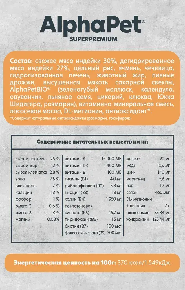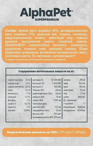 свежее мясо индейки 30%, дегидрированное мясо индейки 18%, цельный ячмень, цельный рис, чечевица, гидролизованная печень, высушенная мякоть сахарной свеклы, животный жир, AlphaPetBIO (зеленогубый моллюск, одуванчик, льняное семя, розмарин, цикорий, томаты, Юкка Шидигера), пивные дрожжи, витаминно-минеральная смесь, форелевое масло, DL-метионин, антиоксидант*. *Содержит натуральные антиоксиданты (розмарин, токоферол).