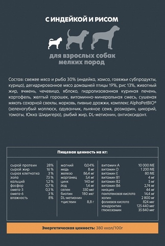 ALPHAPET сухой корм для взрослых собак мелких пород (индейка и рис) 3 кг