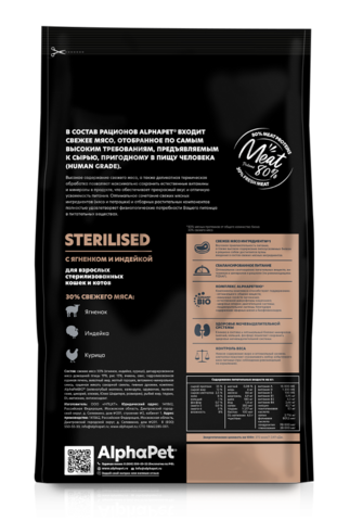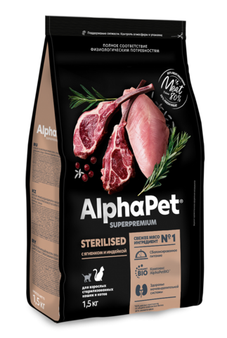 AlphaPet Superpremium / Сухой полнорационный корм с ягненком и индейкой для взрослых стерилизованных кошек и котов