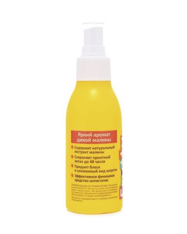 Парфюмерная вода «Фрутти» для собак и кошек состоит из: воды очищенной, ПЭГ-40 гидогенизированного касторового масла, пропиленгликоля, отдушки, экстрактов малины, диметикона и консервантов нового поколения. Без парабенов, красителей и спиртов.