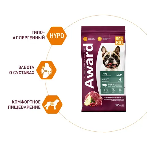 Сухой корм AWARD HYPO для взрослых собак всех пород со свининой с добавлением брусники, груши и розмарина 12 кг.
