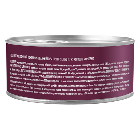 Паштет из курицы с кусочками моркови для котят - это монопротеиновое сбалансированное питание для растущего организма, изготовленое из одного вида мясного белка без содержания зерна и глютена, с добавлением овощей и фруктов богатых витаминами и минералами.