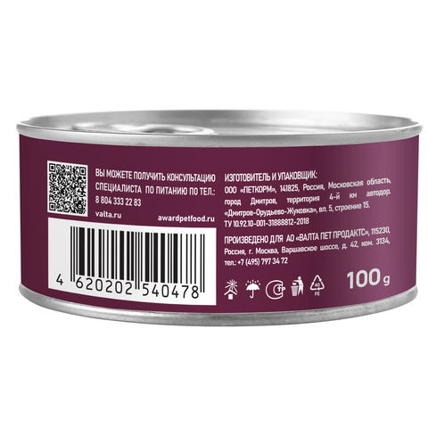 Влажный корм AWARD для взрослых кошек паштет из говядины со шпинатом 100г.
