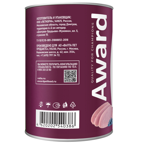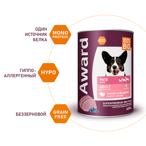 Паштет из индейки с кусочками черники для взрослых собак - это монопротеиновое сбалансированное питание для любимого питомца, изготовленое из одного вида мясного белка без содержания зерна и глютена, с добавлением овощей и фруктов богатых витаминами и минералами.