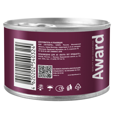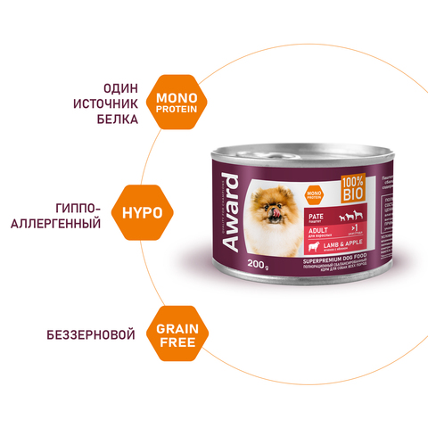 AWARD консервы для взрослых собак паштет из ягненка с яблоком 200г