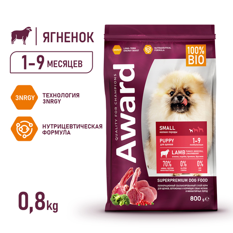 Сухой корм AWARD для щенков от 1 мес, беременных и кормящих сук мелких и мин. пород с ягненком и индейкой с добавлением брокколи и брусники 800 г.