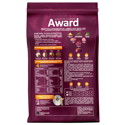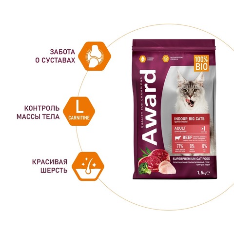Сухой корм AWARD Indoor Big cats для взрослых домашних кошек крупных пород с говядиной и курицей с добавлением брокколи и юкки Шидигера 1,5 кг.