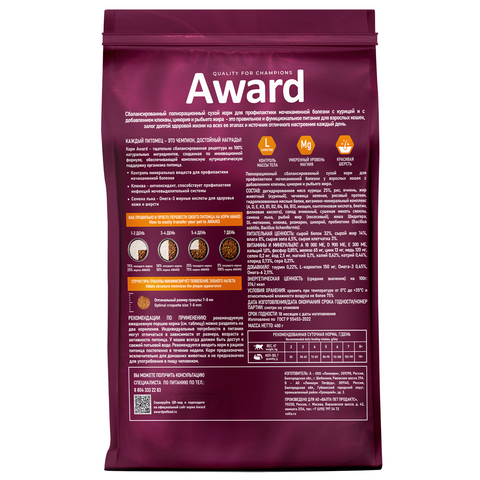 Сухой корм AWARD Urinary для взрослых кошек для профилактики мочекаменной болезни с курицей с добавлением клюквы, цикория и рыбьего жира 400 г.