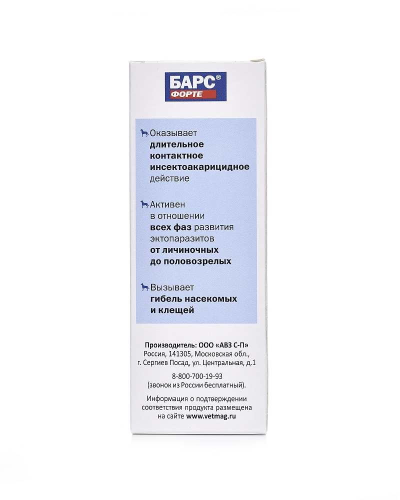 Препарат содержит фипронил, регулятор роста насекомых и вспомогательные вещества, такие как глицерин, касторовое масло и др. Обладает выраженной активностью в отношении личиночных и половозрелых фаз развития блох, вшей, власоедов, иксодовых и саркоптоидных клещей, паразитирующих на собаках и кошках.