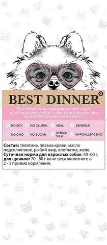 Best Dinner «Натуральная телятина» изготовлен только из натуральных компонентов без искусственных красителей, консервантов и ароматизаторов, обогащен всеми необходимыми витаминами и минеральными веществами.