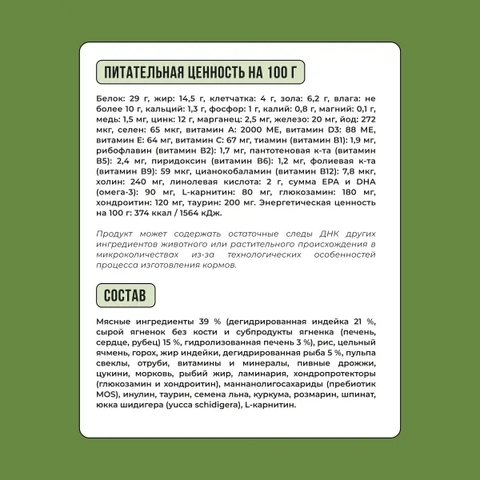Мясные ингредиенты 39 % (дегидрированная индейка 21 %, сырой ягненок без кости и субпродукты ягненка (печень, сердце, рубец) 15 %, гидролизованная печень 3 %), рис, цельный ячмень, горох, жир индейки, дегидрированная рыба 5 %, пульпа свеклы, отруби, витамины и минералы, пивные дрожжи, цукини, морковь, рыбий жир, ламинария, хондропротекторы (глюкозамин и хондроитин), маннанолигосахариды (пребиотик MOS), инулин, таурин, семена льна, куркума, розмарин, шпинат, юкка шидигера (yucca schidigera), L-карнитин.