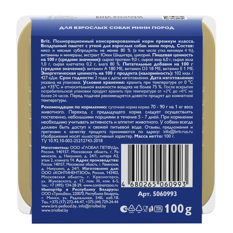 Полнорационный консервированный корм премиум класса с уткой для взрослых собак мини пород.