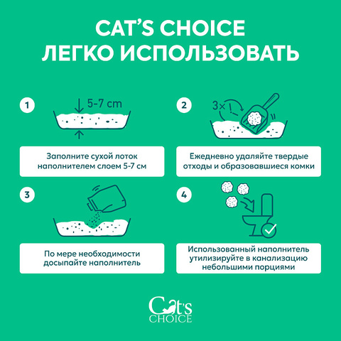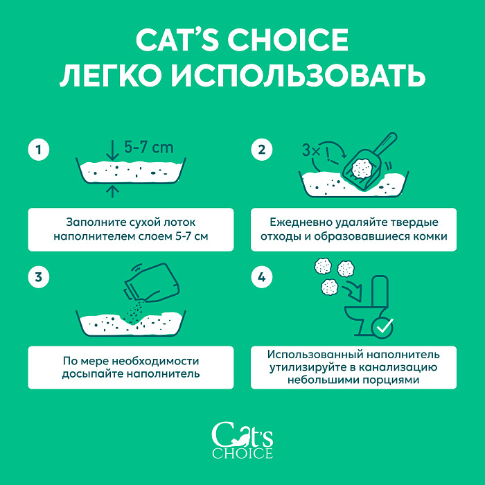 Натуральный растительный наполнитель Cat’s choice из спрессованных соевых волокон с ароматом зеленого чая. Наполнитель быстро абсорбирует влагу и блокирует неприятный запах. Премиальные гранулы диаметром 2 мм обладают способностью образовывать сверхпрочные комки, которые впоследствии легко утилизировать в канализацию. Натуральный состав делает его безопасным для кошек и людей. С Cat’s choice легко поддерживать чистоту и уют в доме.