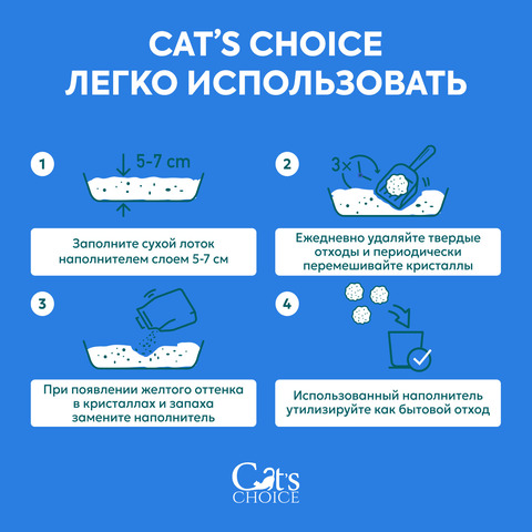 Силикагелевый впитывающий наполнитель Cat’s choice моментально впитывает влагу и блокирует неприятный запах благодаря пористой структуре кристаллов 1-4 мм. Наполнитель препятствует размножению бактерий и грибков за счет своего неорганического происхождения и уникальной способности активно абсорбировать влагу. Легок в использовании, достаточно периодически перемешивать кристаллы. Не прилипает к лапкам и шерсти. С Cat’s choice легко поддерживать чистоту и уют в доме.