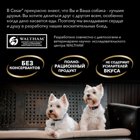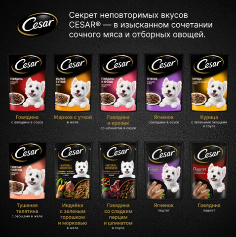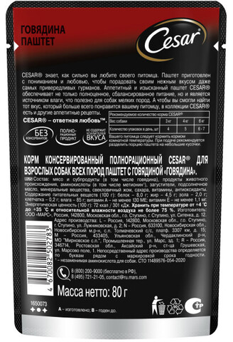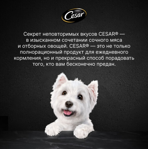 Рекомендуемое количество корма CESAR® (вес животного, кг – упаковок корма в сутки, шт): 3 кг – 4; 4 кг – 5; 6 кг – 6-7. Вашего питомца следует кормить кормом комнатной температуры. Не забывайте о свежей воде, которая должна быть в миске вашего питомца постоянно.