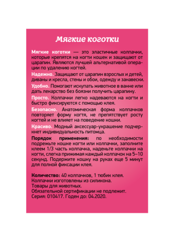 Перед использованием нужно примерить колпачок на коготь. При необходимости подрежьте кошке когти или колпачки.