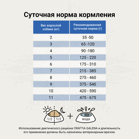 Рекомендации по кормлению: перед применением рекомендуется проконсультироваться с ветеринарным специалистом. Рекомендуемый период кормления: первоначально до 2 месяцев для поддержки функций кожи в случае дерматозов и чрезмерного выпадения шерсти; от 3 до 8 недель при пищевой непереносимости; если признаки непереносимости исчезнут, корм может использоваться до одного года. Продукт готов к употреблению в соответствии с суточными нормами кормления, указанными в таблице. Нормы кормления, указанные на упаковке являются ориентировочными и могут быть скорректированы. Рекомендуется регулярно следить за весом вашего питомца и при необходимости корректировать рацион. Индивидуальные потребности в питании могут отличаться в зависимости от породы, условий содержания, активности и кондиции животного. Суточная норма корма может быть разделена на два кормления. Кошка должна иметь постоянный доступ к свежей питьевой воде. Рекомендуется вводить новый корм в рацион питомца постепенно, начиная с подмешивания нового корма в количестве 25% к 75% текущего, постепенно увеличивая количество нового корма в течение 5-7 дней.