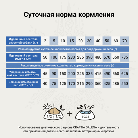 Рекомендации по кормлению: перед применением необходимо проконсультироваться у ветеринарного специалиста. Для эффективного снижения избыточного веса или для поддержания веса не следует превышать рекомендуемую суточную норму потребления корма. Рекомендуемая продолжительность применения: до показателей нормы веса и в период его поддержания. При переводе питомца на диету необходим переходный период. Продукт готов к употреблению в соответствии с суточными нормами кормления, указанными в таблице. Нормы кормления, указанные на упаковке, являются ориентировочными и могут быть скорректированы. Рекомендуется регулярно следить за весом вашего питомца и при необходимости корректировать рацион. Рацион покрывает около 60% потребности собаки в калориях; этот процент может варьироваться в зависимости от возраста, породы, уровня активности, окружающей среды и кондиции питомца. Суточная норма корма может быть разделена на два кормления. Собака должна иметь постоянный доступ к свежей питьевой воде. Рекомендуется вводить новый корм в рацион питомца постепенно, начиная с подмешивания нового корма в количестве 25% к 75% текущего, постепенно увеличивая количество нового корма в течение 5-7 дней.
