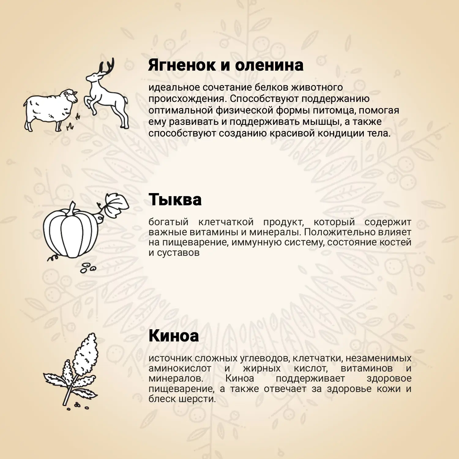 Основные источники белка в корме — свежее мясо ягненка и оленя. Комбинация этих белков легко переваривается, помогает поддерживать оптимальный вес питомца, стабилизирует обмен веществ.  Ягненок и оленина — отличные источники незаменимых аминокислот, витаминов и минералов.