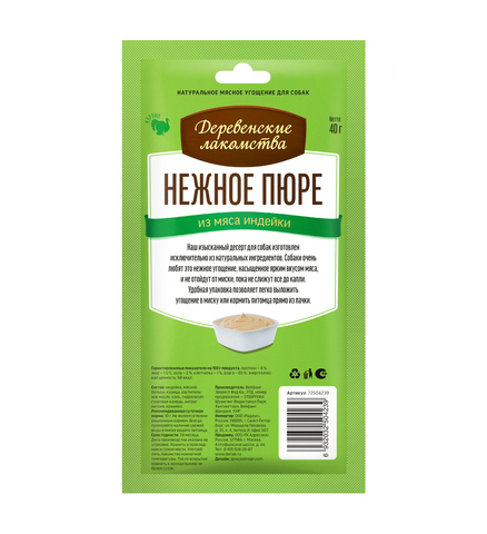 Нежное пюре — изысканный десерт для собак. Изготовлено исключительно из натуральных ингредиентов. Собаки очень любят это нежное угощение с ярким вкусом мяса и не отойдут от миски, пока не слижут всё до капли. Удобная упаковка позволяет легко выложить пюре в миску или кормить питомца прямо из пачки.