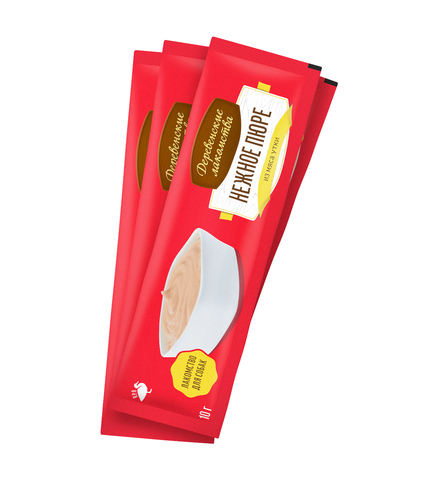 Нежное пюре — изысканный десерт для собак. Изготовлено исключительно из натуральных ингредиентов. Собаки очень любят это нежное угощение с ярким вкусом мяса и не отойдут от миски, пока не слижут всё до капли. Удобная упаковка позволяет легко выложить пюре в миску или кормить питомца прямо из пачки.