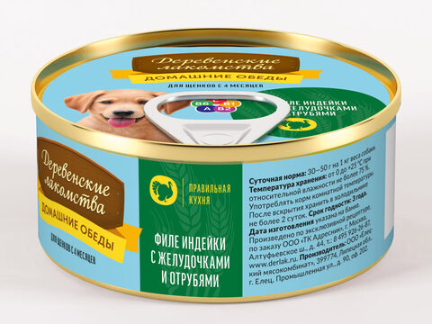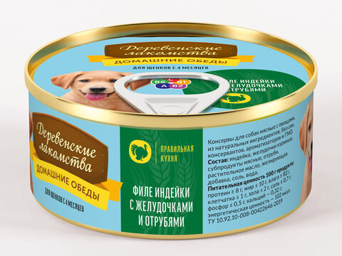 Деревенские лакомства домашние обеды для щенков филе индейки с желудочками и отрубями 100г