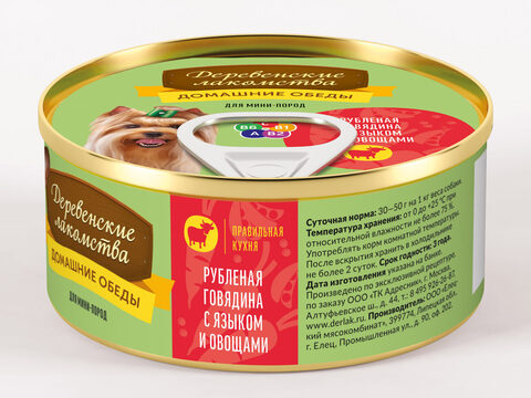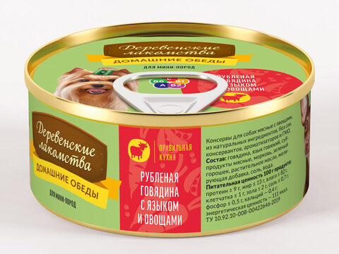 Состав: говядина, язык говяжий, субпродукты мясные, морковь, зелёный горошек, растительное масло, желирующая добавка, соль, вода.