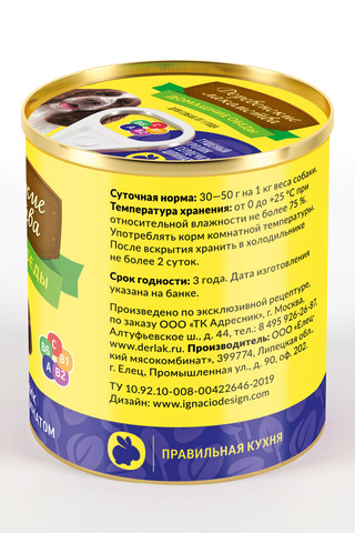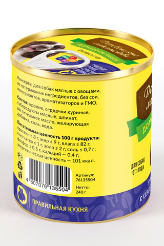 Состав: кролик, сердечки куриные, субпродукты мясные, шпинат, растительное масло, желирующая добавка, соль, вода.