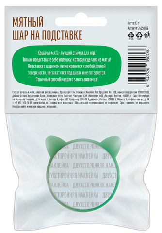 Шарик из кошачьей мяты на подставке — лучший стимул для игр. Подставка с шариком легко крепится к ровной поверхности, не закатится под диван и не потеряется. Диаметр шара — 3 см. Эту игрушку можно даже съесть. Она состоит только из натуральных ингредиентов. Ваша кошка получит огромное удовольствие.