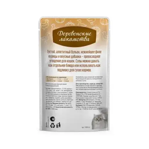 Куриный бульон 71,3 %, курица 20 %, утка 4 %, тыква 4 %, желирующая добавка, экстракт тунца, витамин Е.
