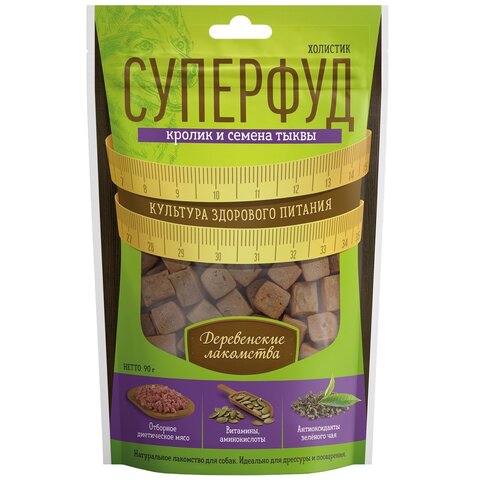 Семена тыквы славятся содержанием большого количества витаминов, аминокислот и минералов. В сочетании с диетическим мясом кролика это лакомство становится полезным и необычайно вкусным. Состав: кролик, семена тыквы, натуральные пищевые добавки: крахмал, зеленый чай, пищевой глицерин, растительный протеин, сорбит, соль. Пищевая ценность: Белки — 25%, Жир — 8%, Клетчатка — 1%, Зола — 5%, Влажность — 23%. Энергетическая ценность в 100 г продукта: 300 ккал. Срок годности: 18 месяцев.
