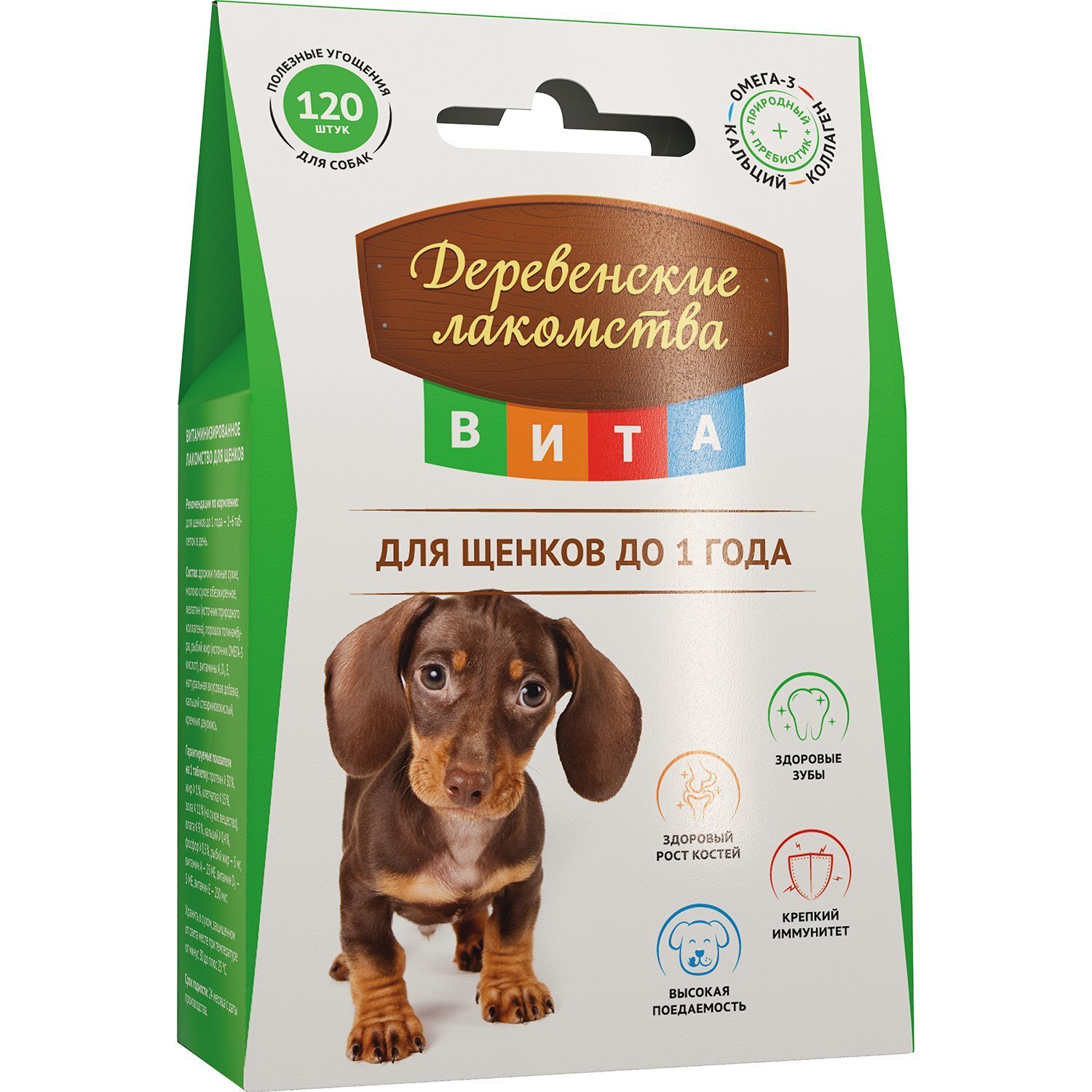 «Деревенские лакомства Вита» содержат всё необходимое для роста и полноценного развития вашего щенка. Кальций способствует здоровому росту костей и зубов, коллаген обеспечивает правильное формирование опорно-двигательного аппарата и укрепляет суставы. ОМЕГА-3 улучшает зрение и работу мозга. Топинамбур содержит природный пребиотик инулин, который содействует пищеварению и выводу токсинов, а пивные дрожжи укрепляют иммунитет. Ну и конечно же, «Деревенские лакомства Вита» — это еще и очень вкусно! Характеристики: Состав:дрожжи пивные сухие, молоко сухое обезжиренное, желатин (источник природного коллагена), порошок топинамбура, рыбий жир (источник ОМЕГА-3 кислот), витамины А, D3, Е, натуральная вкусовая добавка, кальций стеариновокислый, кремния двуокись. Пищевая ценность в 1 таблетки:протеин ≥ 30%, жир ≥ 1%, клетчатка ≤ 15%, зола ≤ 11% (на сухое вещество), влага ≤ 9%, кальций ≥ 0,4%, фосфор ≥ 0,5%, рыбий жир — 5 мг, витамин А — 25 МЕ, витамин D3 — 5 МЕ, витамин Е — 250 мкг. Рекомендации по кормлению:для щенков до 1 года — 1 - 6 таблеток в день. Срок годности: 24 месяцев при температуре от -30 до +25. Вес:60г.