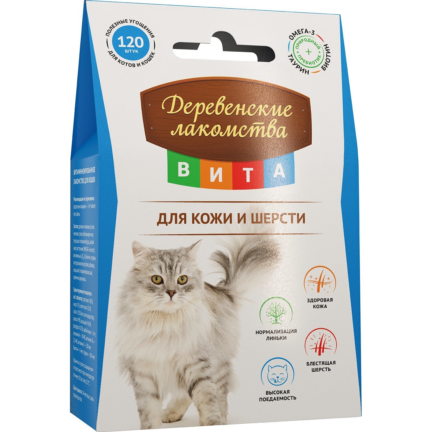 «Деревенские лакомства Вита» содержат всё необходимое для поддержания здоровья вашей кошки. Биотин снижает ломкость шерсти, нормализует линьку, придает шерсти блеск и обеспечивает эластичность кожи. Таурин поддерживает работу сердца и сосудов. Топинамбур содержит природный пребиотик инулин, который содействует пищеварению и выводу токсинов, а ОМЕГА-3 улучшает зрение и работу мозга. Ну и конечно же, «Деревенские лакомства Вита» — это еще и очень вкусно! Характеристики: Состав:дрожжи пивные сухие, молоко сухое обезжиренное, порошок топинамбура, рыбий жир (источник ОМЕГА-3 кислот), витамины А, D3, Е, биотин, таурин, натуральная вкусовая добавка, кальций стеариновокислый, кремния двуокись. Пищевая ценность в 1 таблетки:протеин ≥ 30%, жир ≥ 1%, клетчатка ≤ 15%, зола ≤ 11% (на сухое вещество), влага ≤ 9%, кальций ≥ 0,4%, фосфор ≥ 0,5%, рыбий жир — 5 мг, витамин А — 50 МЕ, витамин D3 — 2,5 МЕ, витамин Е — 150 мкг, биотин — 5 мкг, таурин — 500 мкг. Рекомендации по кормлению:взрослым кошкам — 2–4 таблетки в день. Срок годности: 24 месяцев при температуре от -30 до +25. Вес:60г.
