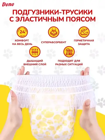 Подгузники для собак сук, кошек и котов - новая модель памперсов для животных, сделанная в форме трусиков с широкой эластичной резинкой на талии. Удобный эластичный пояс без липучек обеспечивает идеальную посадку, не давит на животное и не вызывает дискомфорт при движении. Дышащие одноразовые трусы для животных рекомендованы для собак сук при течке и недержании мочи. Трусы для собак и кошек прекрасно помогают хозяину в уходе за старыми и больными животными. Товар для животных изготовлен из высококачественных абсорбирующих материалов в сочетании с суперабсорбентом SAP, которые мгновенно превращают жидкость в непротекаемый гель и поглощают неприятные запахи. Для предотвращения утечки жидкости через края подгузника внутри имеется двойной ряд эластичных гофрированных боковин и проклеенное отверстие для хвоста. Внутренний слой, соприкасающийся с нежной паховой кожей животного, всегда остается сухим. Мягкие и комфортные трусики гарантируют отсутствие раздражений на коже питомца. Протекания и неприятный запах исключены.
