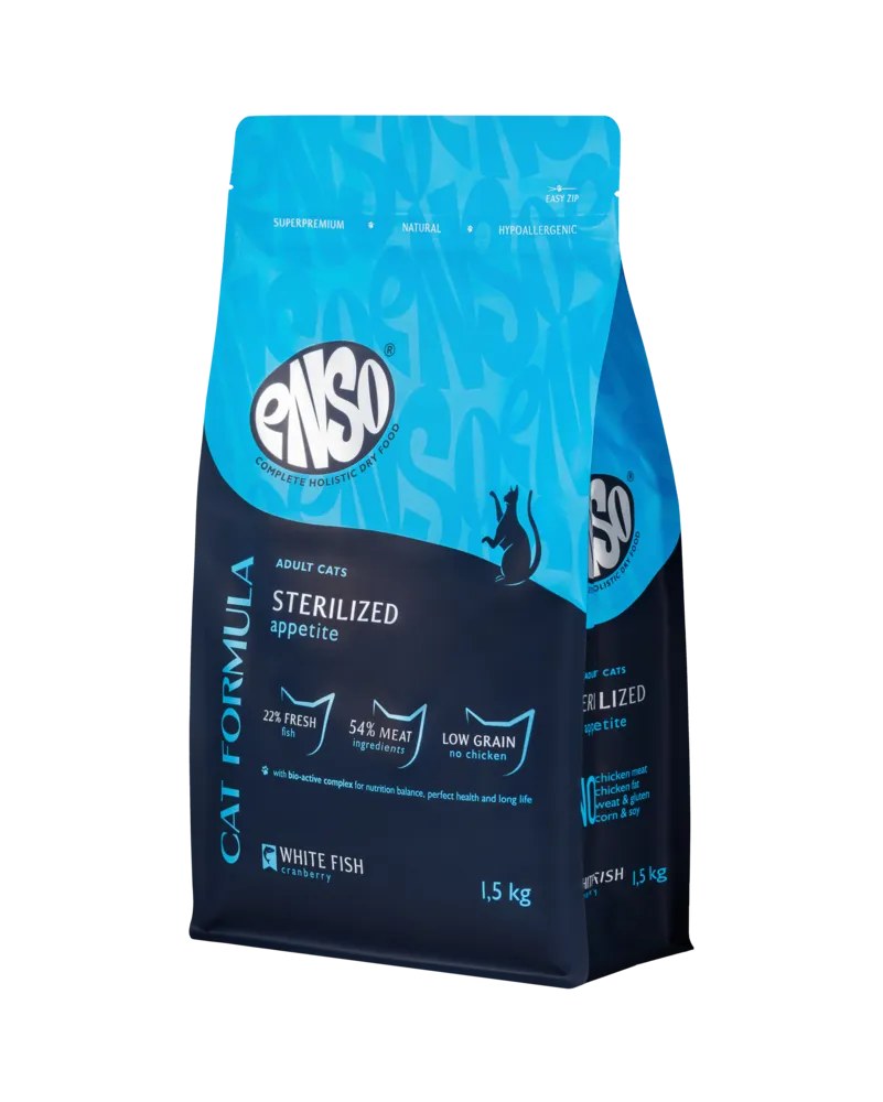 ENSO Cat Formula Sterilized – сухой полнорационный корм для стерилизованных кошек со свежей белой рыбой с добавлением клюквы.