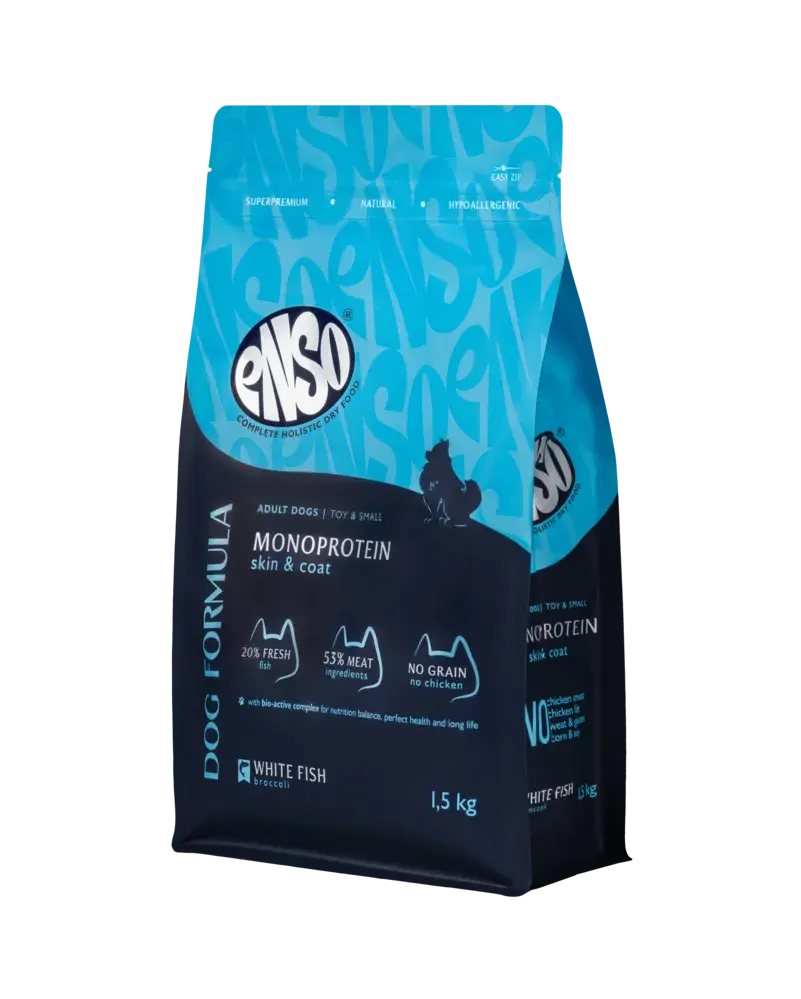 ENSO Dog Formula Monoprotein – сухой полнорационный корм для взрослых собак мелких и миниатюрных пород со свежей белой рыбой с добавлением брокколи.