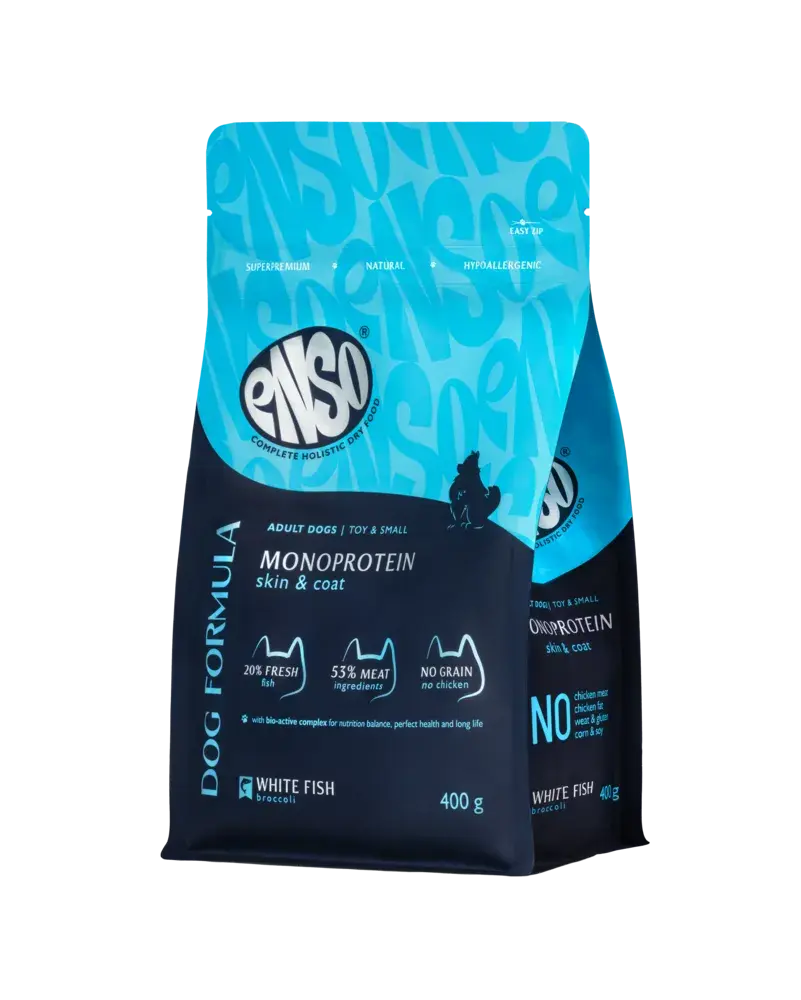 ENSO Dog Formula Monoprotein – сухой полнорационный корм для взрослых собак мелких и миниатюрных пород со свежей белой рыбой с добавлением брокколи.