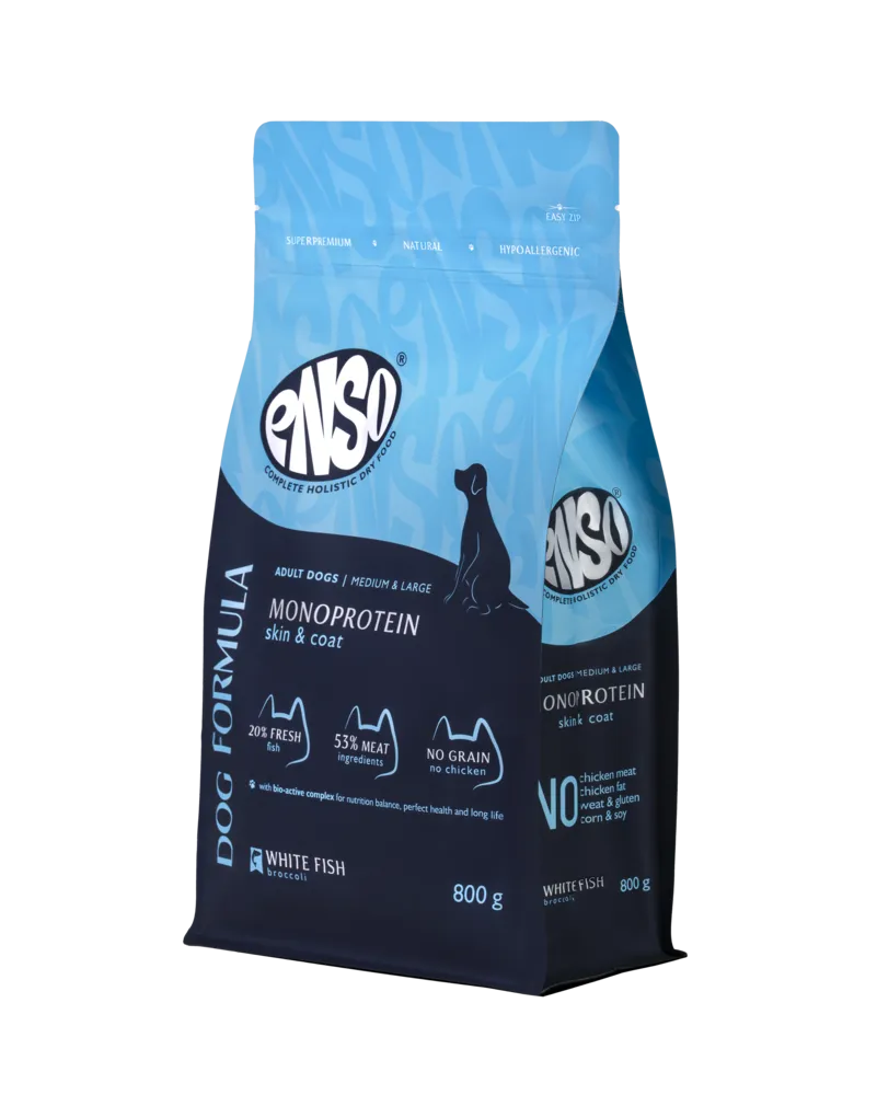 ENSO Dog Formula Monoprotein – сухой полнорационный корм для взрослых собак средних и крупных пород со свежей белой рыбой с добавлением брокколи.