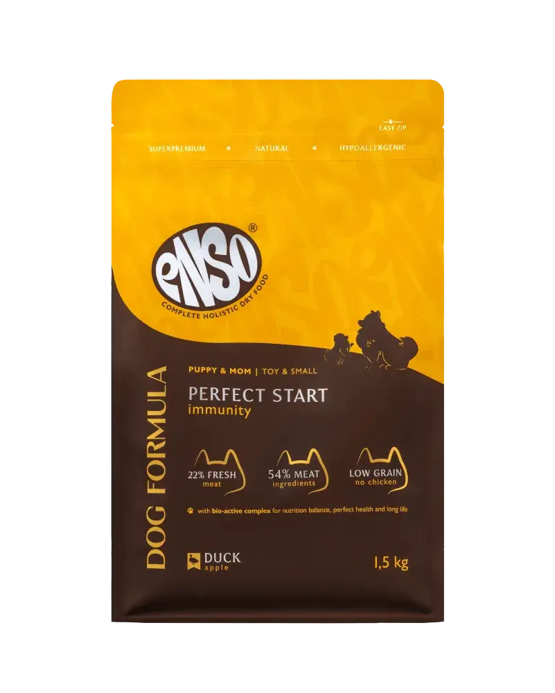 ENSO Dog Formula Perfect start – сухой полнорационный корм для щенков от 1 месяца, беременных и кормящих собак мелких и миниатюрных пород со свежей уткой с добавлением яблок.