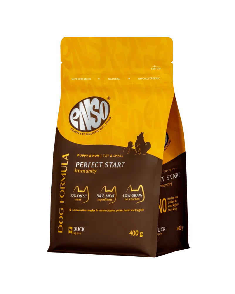 ENSO Dog Formula Perfect start – сухой полнорационный корм для щенков от 1 месяца, беременных и кормящих собак мелких и миниатюрных пород со свежей уткой с добавлением яблок.