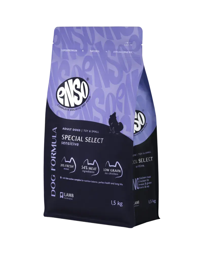 ENSO Dog Formula – гипоаллергенная линия сухих кормов класса суперпремиум холистик для ежедневного поддержания здоровья собак с высоким содержанием свежего мяса (20%) без курицы и куриного жира, сои, пшеничного глютена и ГМО.
