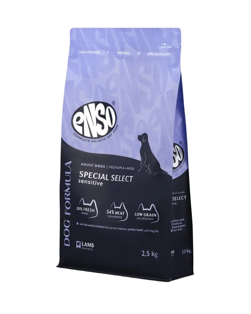 ENSO Dog Formula Special select сухой полнорационный корм для взрослых собак средних и крупных пород со свежим ягненком с добавлением томата.