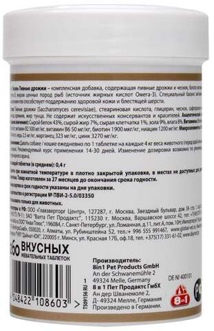 Пивные дрожжи (Saccharomyces cerevisiae) – 91%, стеариновая кислота, масла и жиры (глицерин, сафлоровое масло, жир тунца) – 6,9%, чеснок – 1,2%, диоксид кремния – 0,9%. Не содержит искусственных консервантов и красителей.