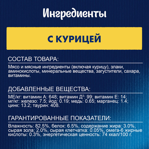 мясо и мясные ингредиенты (включая курицу), злаки, аминокислоты, минеральные вещества, загустители, сахара, витамины.