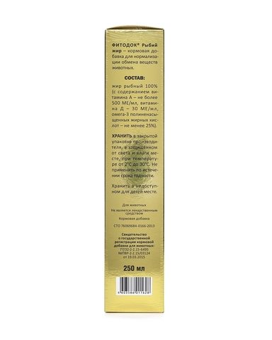 В состав кормовой добавки входит жир рыбный ветеринарный -100% (с содержанием витамина А – не более 500 МЕ/мл, витамина D –