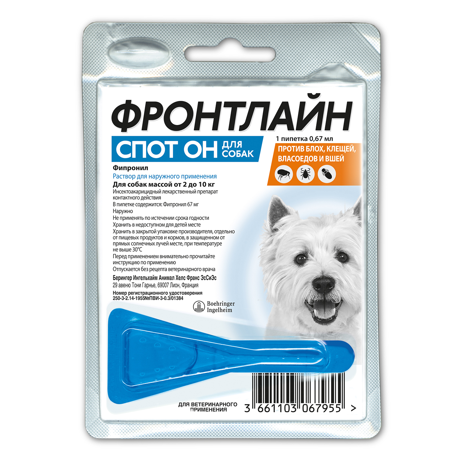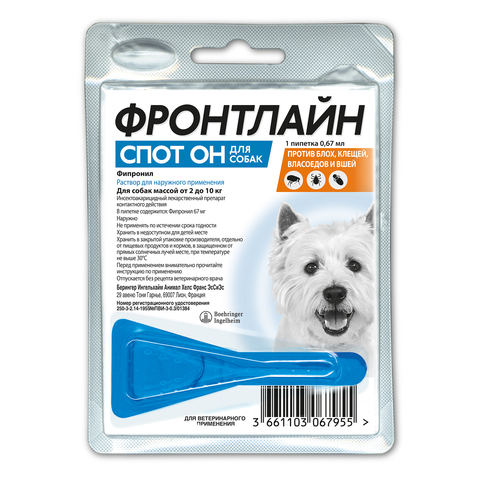 Фронтлайн СПОТ ОН капли для собак 0,67мл 2-10кг 1пипетка
